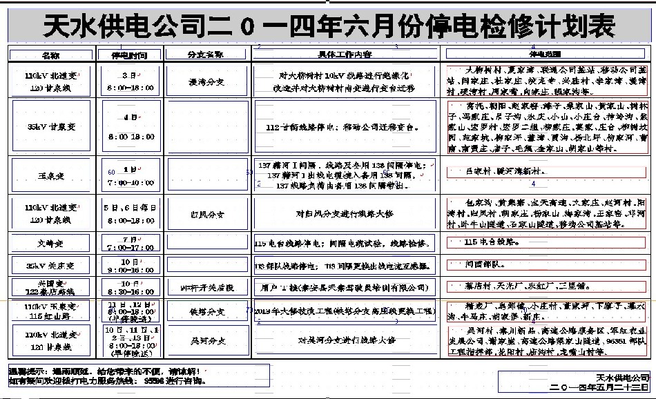 天水供電公司二0一四年六月份停電檢修計(jì)劃表