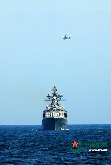 ????5月23日上午9時(shí)許,聯(lián)合護(hù)航課目演練在某海域展開,俄海軍097船模擬被護(hù)船只,中俄海軍兩個(gè)艦艇編隊(duì)各自單縱隊(duì),分列被護(hù)船只兩側(cè)。期間,還組織鄭州艦和瓦良格號(hào)艦載直升機(jī)起飛、互降。