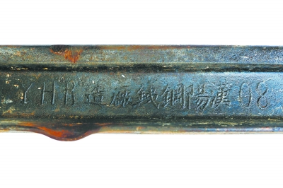 約120歲的鋼軌上鑄有“漢陽鋼鐵廠造”的字樣 記者彭年 攝