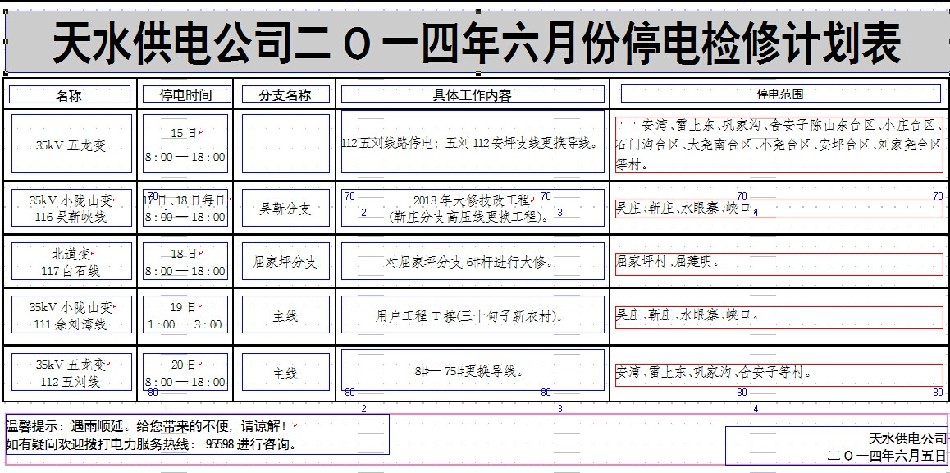 天水供電公司二O一四年六月份停電檢修計(jì)劃表