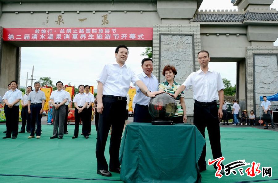 ????市人大常委會副主任蕭菡宣布“敦煌行?絲綢之路國際旅游節(jié)第二屆清水溫泉消夏養(yǎng)生旅游節(jié)”開幕;市政府副市長張建杰講話;清水縣委副書記、縣長馬越垠致辭;甘肅天水昊峰集團(tuán)控股有限公司黨委書記、董事長程俊峰致辭;白曉玲、馬越垠、蔡瑞峰、程俊峰共同啟動“暢享中國移動·暢游軒轅故里”旅游推介活動和“飲天河美酒·沐清水溫泉”旅游酬賓活動??h委常委、縣政府副縣長馬小龍主持儀式。