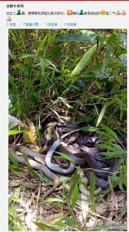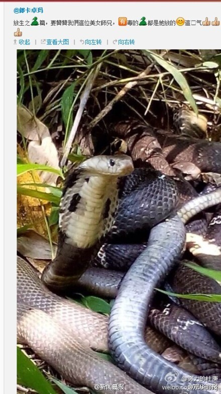 ????京華時(shí)報(bào)【網(wǎng)友在廣東省一公園放生五步蛇眼鏡蛇】@郎卡卓瑪在其微博大秀放生祈福事件(微博已刪),而放生的對(duì)象竟是毒蛇!據(jù)網(wǎng)友指認(rèn)其中有五步蛇以及眼鏡蛇等劇毒蛇種!而放生的地點(diǎn)是廣東省內(nèi)某公園!試想一下,如果去公園游玩或散步的居民不幸遭遇放生的毒蛇...這到底是積德還是造孽?