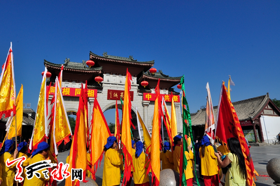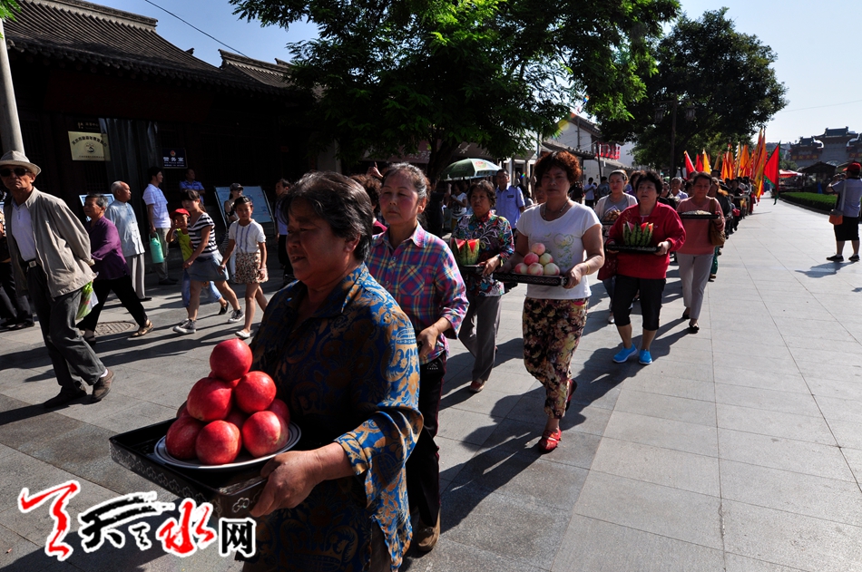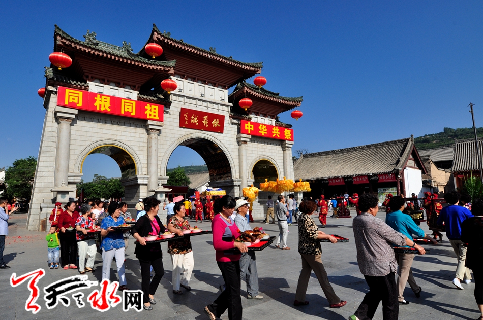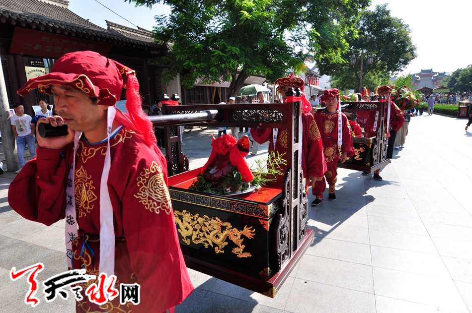 群眾自發(fā)組成的儀仗隊(duì)沿伏羲城環(huán)繞一周迎獻(xiàn)飯