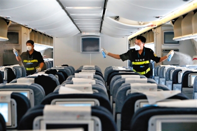 ????昨日,首都國際機場,一架來自德國法蘭克福的航班抵達后,檢驗檢疫人員對機艙進行消毒防疫。法蘭克福是西非埃博拉出血熱疫區(qū)的旅客進入中國可能的中轉(zhuǎn)地之一。 新華社記者 沈伯韓 攝