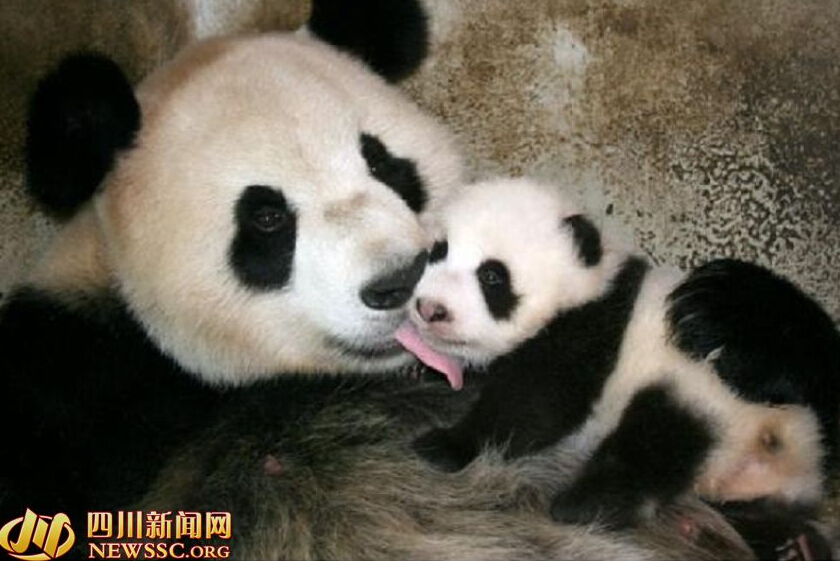 ????熊貓媽媽產(chǎn)仔后剛開始會不吃不喝,把寶寶抱在懷里,用舌頭舔舐寶寶全身。這種行為,動管部部長羅波說,除了可以幫助幼仔排便、清潔寶寶全身以外,母親唾液中所含有的鐵合蛋白,還具有抗病消炎、防止感染的作用,同時(shí),通過舔舐,還可以幫助新生幼仔保持皮膚溫度,防止水分超量蒸發(fā)。