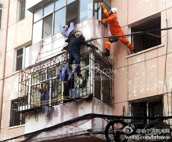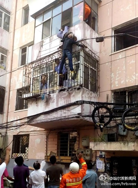 ????8月24日,哈市道里區(qū)河廣街18號三單元301室一名老太從陽臺墜落,卡在晾衣架上。緊急時刻,一名男子迅速爬到2樓陽臺防護網(wǎng)上用肩擎住老人十多分鐘,隨后派出所民警與消防官兵趕到共同將老人救下。圖片來源:哈爾濱新聞網(wǎng)官方微博