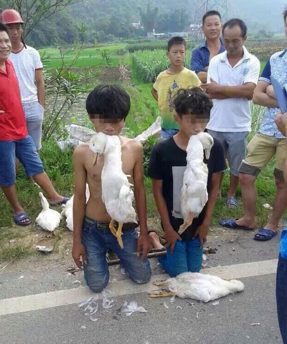 ????8月25日,宜州市慶遠(yuǎn)鎮(zhèn)六坡村兩名約14歲的少年,拿著編織袋竄到村里乘機作案,當(dāng)發(fā)現(xiàn)一家農(nóng)戶在地里干活,10多只鴨散養(yǎng)在家門口后,兩少年相互配合,把鴨子塞進編織袋里,然后扛著編織袋往宜州城區(qū)逃跑,可還沒逃出村口,兩人就被發(fā)現(xiàn)了,并被村民逮了個正著。抓住兩人后,村民們沒有報警,而是對兩少年進行了體罰。他們首先強迫兩人用嘴咬住鴨子頸脖,跪在路邊示眾,一位村民覺得這樣還不夠泄氣,又把兩只鴨子的腳綁起來,加掛在兩人的頸脖上,變成了每人“掛著”三只鴨子跪在路邊。