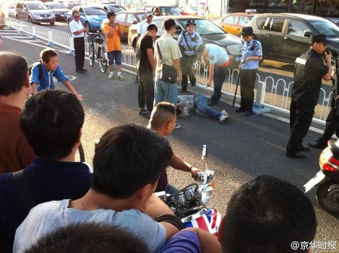 ????京華時報官方微博9月4日消息,晚6點左右,朝陽區(qū)安貞門地鐵站c口通道內(nèi),一男子持菜刀徘徊,地鐵巡警趕到時男子跑出地鐵口。在警方和男子對峙過程中,男子連拉路邊多輛車車門后進入一輛轎車,司機見狀下車逃跑,多名警察上前將男子控制。事件未造成人員傷亡,具體情況警方尚在調(diào)查。圖片來源:京華時報官方微博