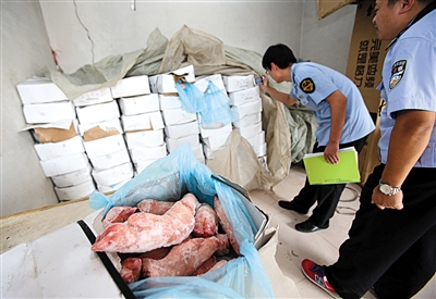 ????9月5日,朝陽區(qū)食藥監(jiān)局食品藥品稽查大隊和北京市食品藥品稽查總隊、北京市公安局經(jīng)偵總隊、朝陽經(jīng)偵支隊及當(dāng)?shù)嘏沙鏊穆?lián)合執(zhí)法人員,對涉案加工作坊及攤位進(jìn)行了查處,查扣了生豬蹄、雙氧水、火堿、大紅等大量原料,并立案調(diào)查。