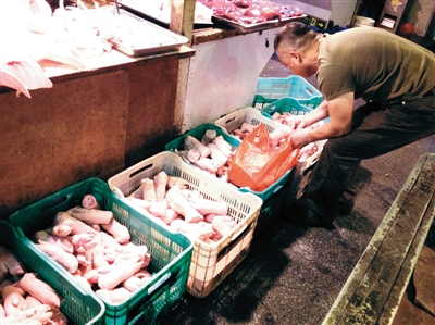 ????在顧客挑選后,大筐內(nèi)剩下的往往是泛黃的豬蹄。