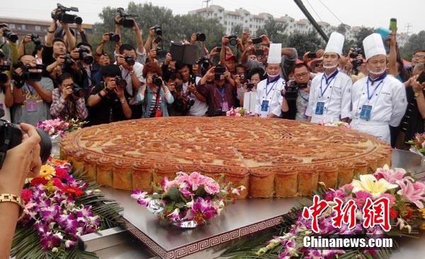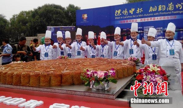 ????9月8日,直徑2.123米、厚13.3厘米、總重量約900斤,選用優(yōu)質蓮子打底、蘭州特產百合約700斤為餡料、輔以160斤面粉、經過20名月餅制作大師精心加工而成的巨型月餅亮相甘肅蘭州,經世界紀錄認證官現場認證,該月餅為世界最大的百合月餅。杜萍 攝