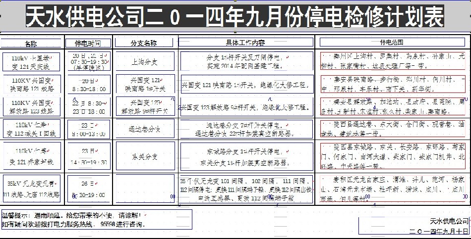 天水供電公司二0一四年九月份停電檢修計劃表