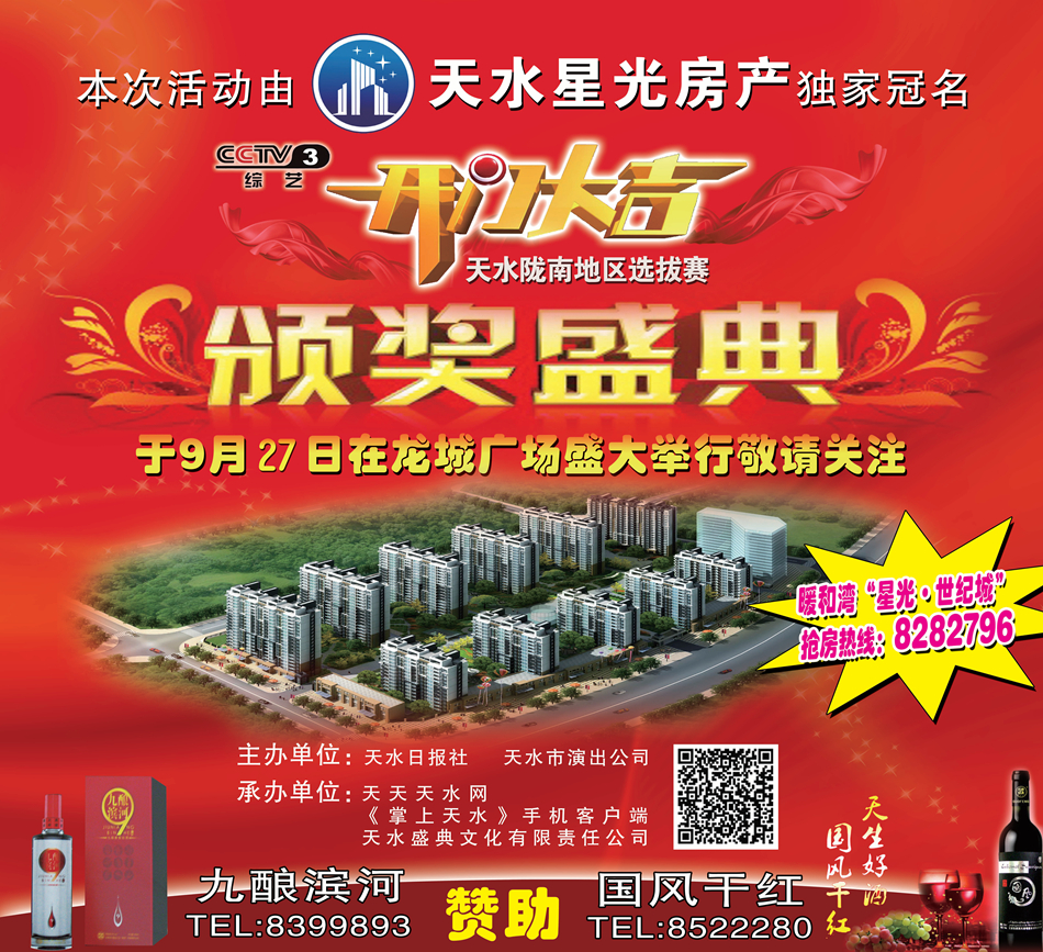 ????2014中央電視臺(tái)《開門大吉》甘肅選拔活動(dòng)由中央電視臺(tái)綜藝頻道節(jié)目部、省委宣傳部、省精神文明指導(dǎo)建設(shè)委員會(huì)辦公室、省廣播電影電視總臺(tái)、省文化廳、省教育廳等單位聯(lián)合舉辦。其中天水隴南賽區(qū)由天水日?qǐng)?bào)社和天水市演出公司主辦,《掌上天水》手機(jī)客戶端、天天天水網(wǎng)和天水盛典文化有限公司承辦,天水星光房地產(chǎn)開發(fā)有限公司獨(dú)家冠名,由甘肅濱河國(guó)風(fēng)干紅和九糧天脈品牌營(yíng)銷公司贊助,旨在為“開門大吉”欄目選送助演嘉賓。選拔賽于今年7月啟動(dòng)后,先后有220多名選手參加海選,經(jīng)過(guò)各縣區(qū)海選,復(fù)賽,決賽最終選出了牛旦、侯婷等十佳選手。這十名優(yōu)秀選手經(jīng)中央電視臺(tái)各欄目組導(dǎo)演現(xiàn)場(chǎng)總選拔面試點(diǎn)評(píng)合格者,將入選中央電視臺(tái)《星光大道》欄目備用選手庫(kù)。