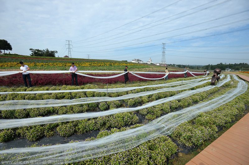????2014年9月24日,四川省成都市,模特穿上4100米婚紗展示。當(dāng)日,為了迎接國(guó)慶大假,工作人員在成都“紫頤-香薰山谷”里擺放一款4100米長(zhǎng)的婚紗,該婚紗的拖尾用單層網(wǎng)紗制作而成,寬度1.5米,耗時(shí)一個(gè)月,大約花費(fèi)4萬(wàn)元。目前世界上最長(zhǎng)婚紗的吉尼斯紀(jì)錄為2012年由羅馬尼亞人創(chuàng)造的2977米。主辦方現(xiàn)正積極申請(qǐng)吉尼斯世界紀(jì)錄。