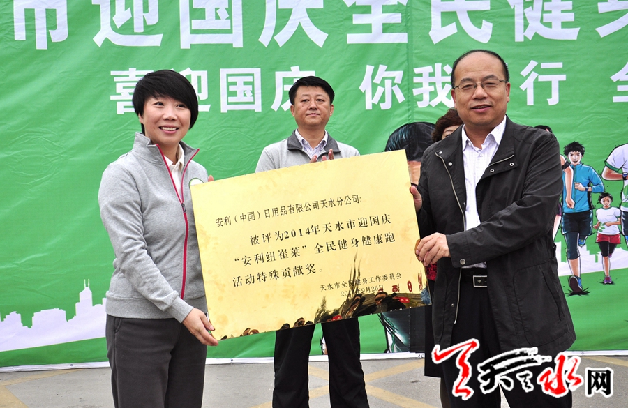 ????起跑儀式前彭鴻嘉為贊助單位安利(中國)日用品有限公司頒發(fā)紀(jì)念獎牌; 市體育局宣讀了《全民健身倡議書》