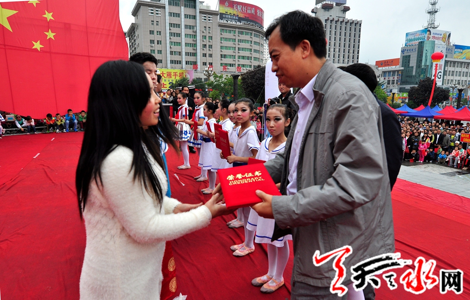 天天天水網(wǎng)訊(記者何永德 黃虹) 9月27日下午,在喜迎建國65周年之際,備受關(guān)注的 2014中央電視臺《開門大吉》甘肅選拔活動天水隴南地區(qū)選拔賽頒獎盛典在天水龍城廣場隆重舉行,從220多位參賽選手中脫穎而出10位佼佼者成為人們視覺焦點,在隆重的頒獎盛典中見證了自己的收獲。