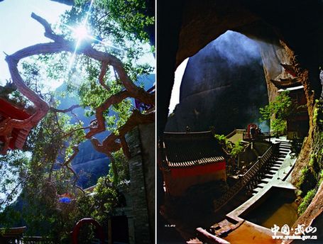 ????壁畫前方即水簾洞寺院,建釋道兩教數(shù)十座亭臺樓閣殿宇廟堂及精美神像。水簾洞在隋代中葉就有諸多建筑,以後各代均有擴(kuò)建修補?,F(xiàn)存建筑群,系近代實物,依地勢布局,或架懸崖,或嵌入巖際,構(gòu)思巧妙,工藝精湛,古色古香,妙趣橫生。