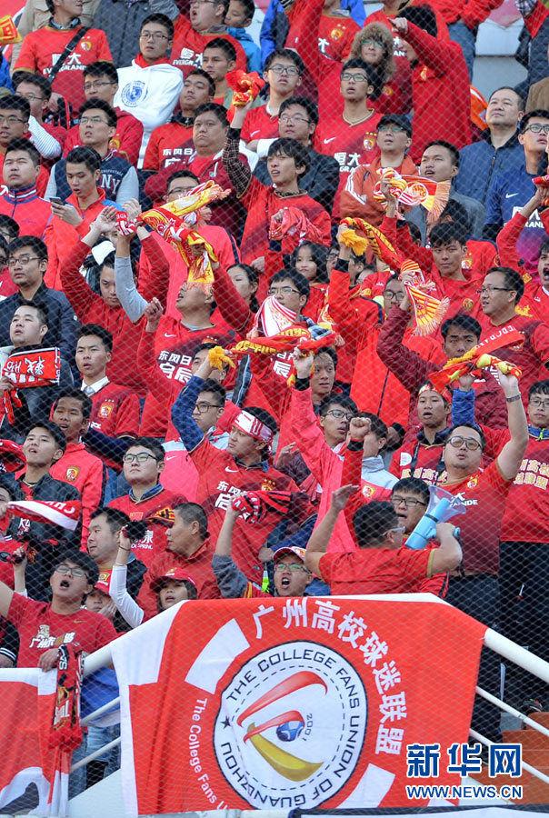 ??? 11月2日,廣州球迷在看臺上為球隊加油。當日,在2014年中國足球超級聯(lián)賽第30輪比賽中,廣州恒大隊客場以1比1戰(zhàn)平山東魯能隊,奪得本賽季中超聯(lián)賽冠軍。 新華社記者朱崢攝