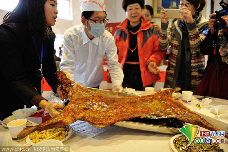 ????2014年11月1日,甘肅蘭州一開發(fā)商在售樓處免費宴請購房者吃烤全羊,數(shù)百名購房者在售樓處享用了一頓蘭州經典美食烤全羊大餐。(東方IC)