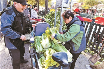 ????本周五將迎來立冬節(jié)氣,近日東直門、北新橋附近的老街坊們?nèi)匀话赐甑牧?xí)慣往家里囤上幾百斤大白菜。據(jù)北新橋同日升糧店王經(jīng)理介紹,今年冬儲大白菜每斤0.4元,大蔥每斤1.2元。目前已有4萬斤大白菜被市民們抱回了家?!百I冬儲菜都是附近居住的老住戶,老人還是相信白菜這口兒對身體的好處,關(guān)鍵刮風(fēng)下雪的時候,有了這幾百斤菜就不用出門了啊。一般住樓房的居民囤200斤,住平房的買500至600斤。只要老街坊們有需要,我們就肯定會一直賣下去?!睌z影/本報記者 汪震龍