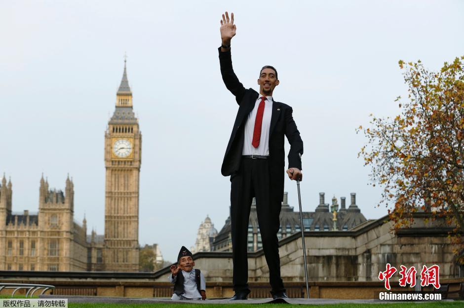 ??? 當(dāng)?shù)貢r(shí)間11月13日,全世界最高的男人,2米51的蘇丹·克森(Sultan Kosen)和世界上最矮的男人,身高僅0.546米的坎德拉·巴哈杜爾(Chandra Bahadur Dangi)共同亮相倫敦,慶祝第60版吉尼斯世界紀(jì)錄問世。