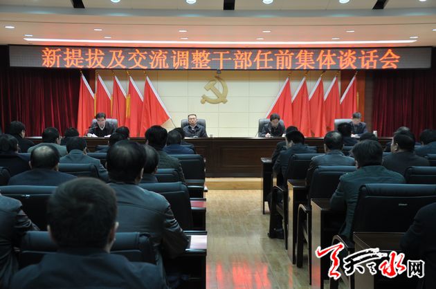 ????天天天水網(wǎng)訊【記者 邵蘭霞】12月2日,天水市委召開(kāi)新調(diào)整干部任前集體談話(huà)會(huì)。市委書(shū)記王銳出席會(huì)議并要求,新調(diào)整干部要講黨性、顧大局,正確對(duì)待進(jìn)退流轉(zhuǎn),以良好的精神面貌投入到新的工作中去,自覺(jué)擔(dān)負(fù)起領(lǐng)導(dǎo)和推動(dòng)全市改革發(fā)展的重任,不辜負(fù)組織的信任和期望,努力為全市經(jīng)濟(jì)社會(huì)轉(zhuǎn)型跨越發(fā)展作出積極貢獻(xiàn)。