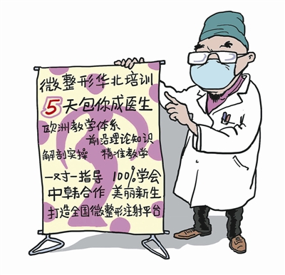 ????北青報記者看到該則培訓(xùn)廣告,廣告聲稱,交付5800元的學費,即可學習全面部注射美容微整培訓(xùn)課程,包括肉毒素除皺紋以及玻尿酸填充鼻子、下巴和瘦臉針等,所有課程在5天內(nèi)結(jié)束,經(jīng)過考核可頒發(fā)證書。“微整形”是一種不經(jīng)過開刀的整形術(shù),一般用于除皺、隆鼻、美白、瘦臉等整形當中。
