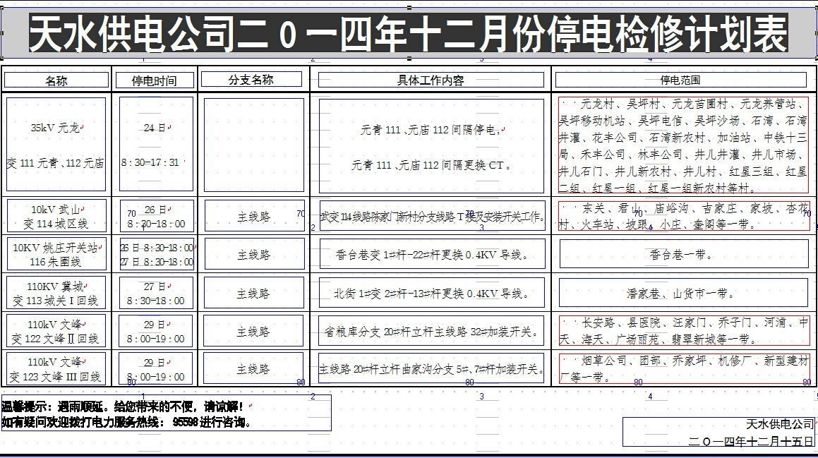 天水供電公司二0一四年十二月份停電檢修計(jì)劃表