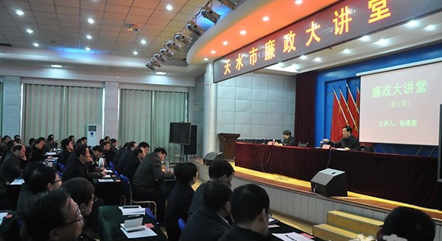 ????12月12日,天水市廉政大講堂第三講在市委黨校大禮堂開講。市委副書記、市長(zhǎng)楊維俊作了題為《加強(qiáng)黨風(fēng)廉政建設(shè),努力打造廉潔政府》的專題輔導(dǎo)報(bào)告。