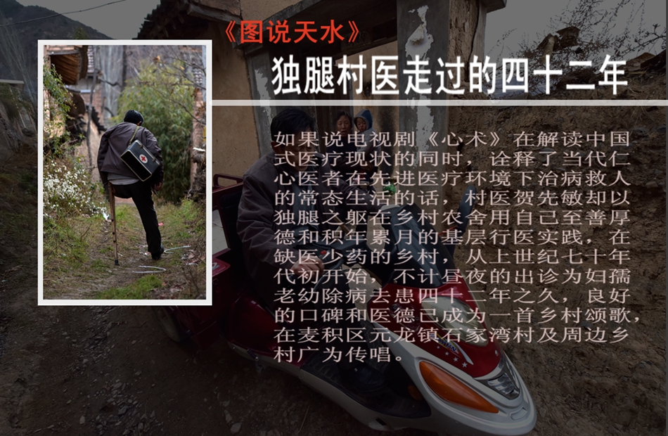 核心提示:如果說電視劇《心術(shù)》在解讀中國式醫(yī)療現(xiàn)狀的同時,詮釋了當(dāng)代仁心醫(yī)者在先進(jìn)醫(yī)療環(huán)境下治病救人的常態(tài)生活的話,村醫(yī)賀先敏卻以獨腿之軀在鄉(xiāng)村農(nóng)舍用自己至善厚德和積年累月的基層行醫(yī)實踐,在缺醫(yī)少藥的鄉(xiāng)村,從上世紀(jì)七十年代初開始,不計晝夜的出診為婦孺老幼除病去患四十二年之久,良好的口碑和醫(yī)德已成為一首鄉(xiāng)村頌歌,在麥積區(qū)元龍鎮(zhèn)石家灣村及周邊鄉(xiāng)村廣為傳唱。