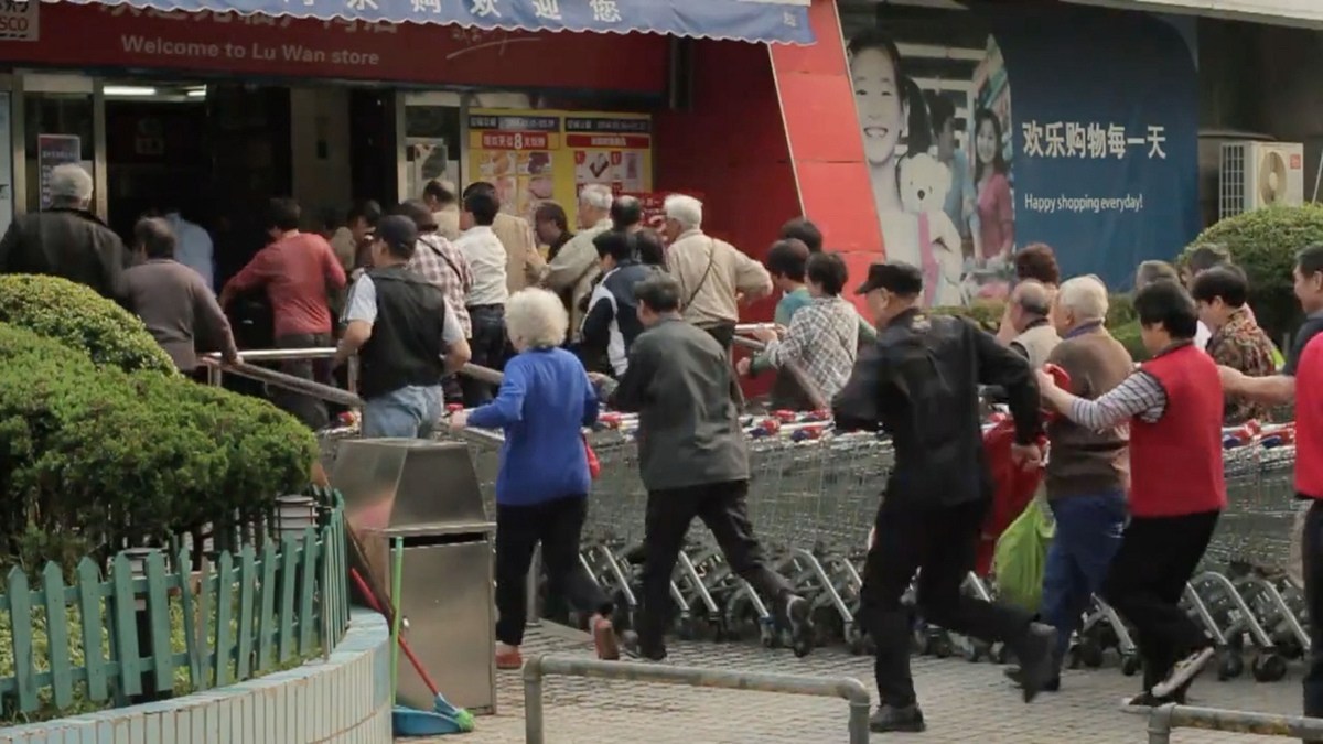 ????2014年12月18日?qǐng)?bào)道,這組圖片由兩名外國(guó)人Jonathan Meador和Jonathon Lim從14樓高層陽臺(tái)拍攝記錄,它們展示了不同季節(jié)上海一家樂購(gòu)超市門口,大批年齡在60歲以上的老人早早在店門口排隊(duì)等候,待開門后蜂擁擠進(jìn)超市的場(chǎng)景。