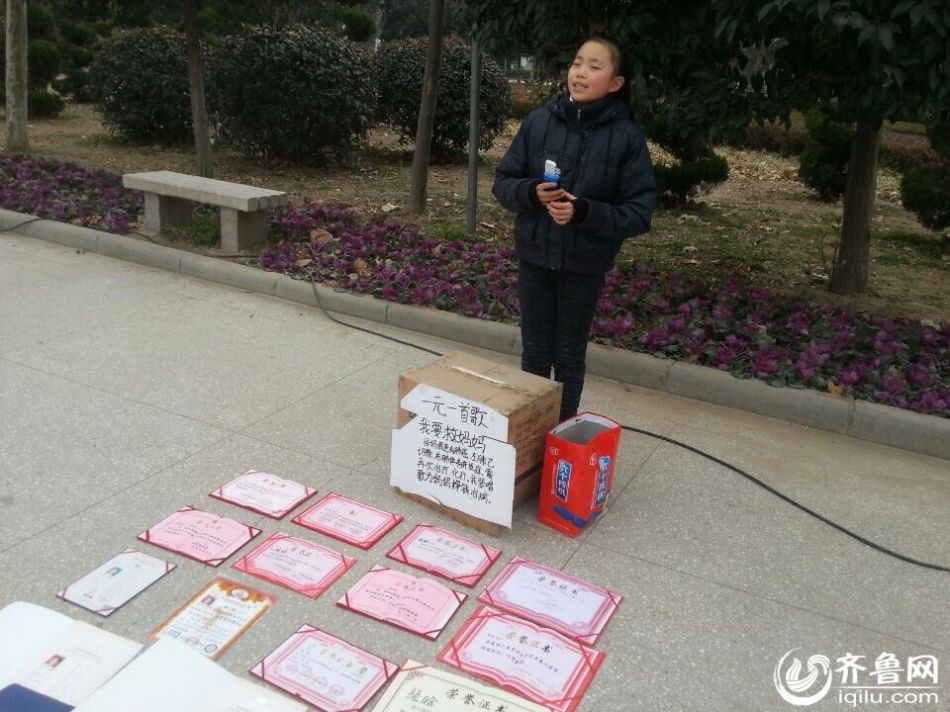 ??? 近日,在菏澤成武縣的街頭,時常傳來優(yōu)美動聽的歌聲。然而站在寒風中唱歌的女孩,不是在練歌,而是在賣唱。她叫張晗,是菏澤成武縣實驗中學(xué)的一名初一學(xué)生,今年13歲。小張晗站在街頭放聲歌唱,在她的前方擺放著她的多項獲獎證書,而在獲獎證書旁,則擺著一個紙箱,上面寫著“一元一首歌,我要救媽媽”。原來,張晗的媽媽患有癌癥,她在街頭賣唱,是為患癌癥的媽媽籌錢治病。(齊魯網(wǎng)記者 張偉 通訊員 竇建平 攝)