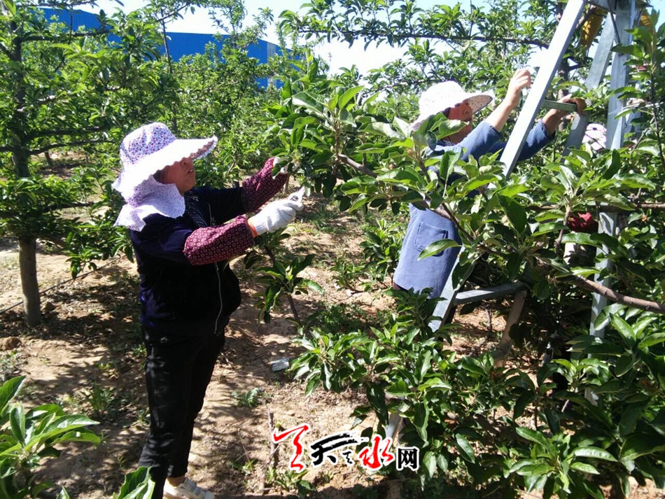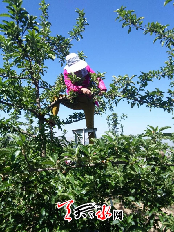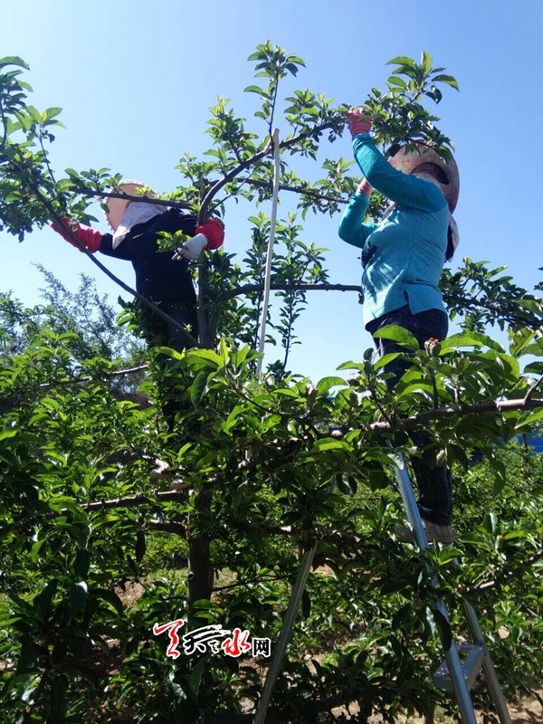 ????天天天水網(wǎng)15日16時訊【記者?何慧娟】5月15日,在位于麥積區(qū)二十里鋪的南山萬畝花牛蘋果基地,果農(nóng)們正在為蘋果樹疏果。