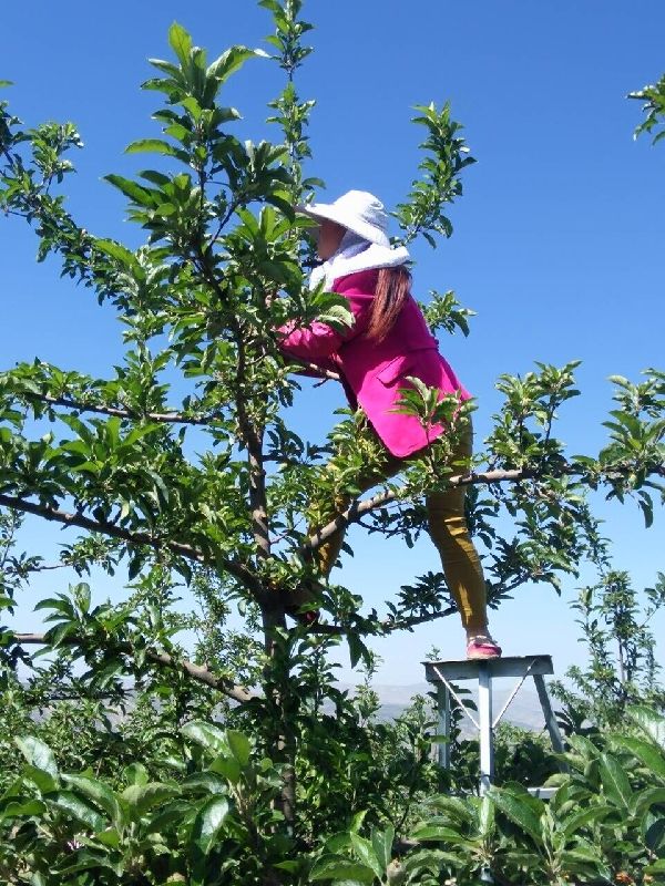 ????“蘋果的好壞就決定于梳花疏果,疏花時留兩朵花,到疏果的時候再選長勢更好的一只果子留下。如果不疏果,蘋果雖然數(shù)量多,但長不大,價錢就上不去。還有色度也趕不上。”果園負責人老張說。