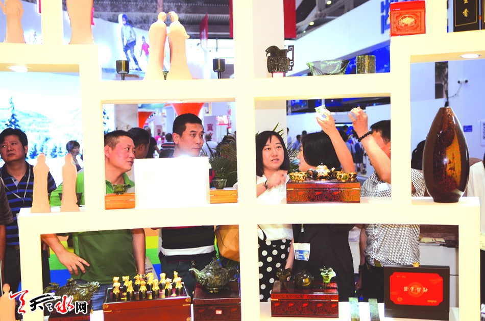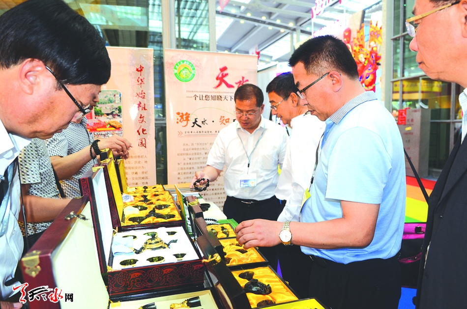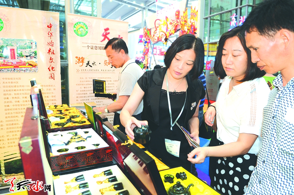 ????▲天水市參展工作人員給來客介紹天水文化產(chǎn)品