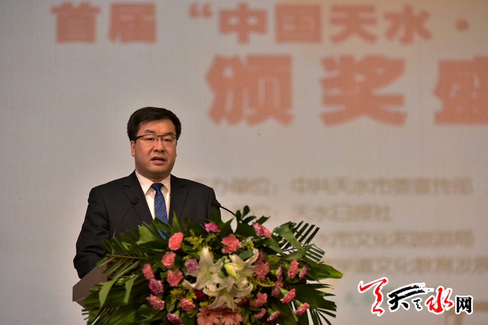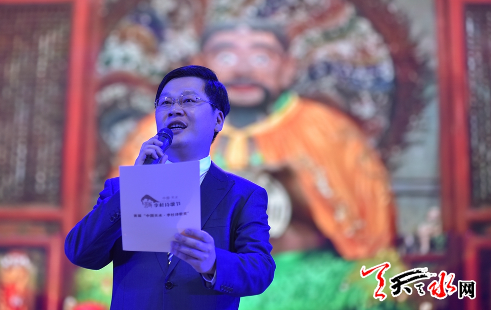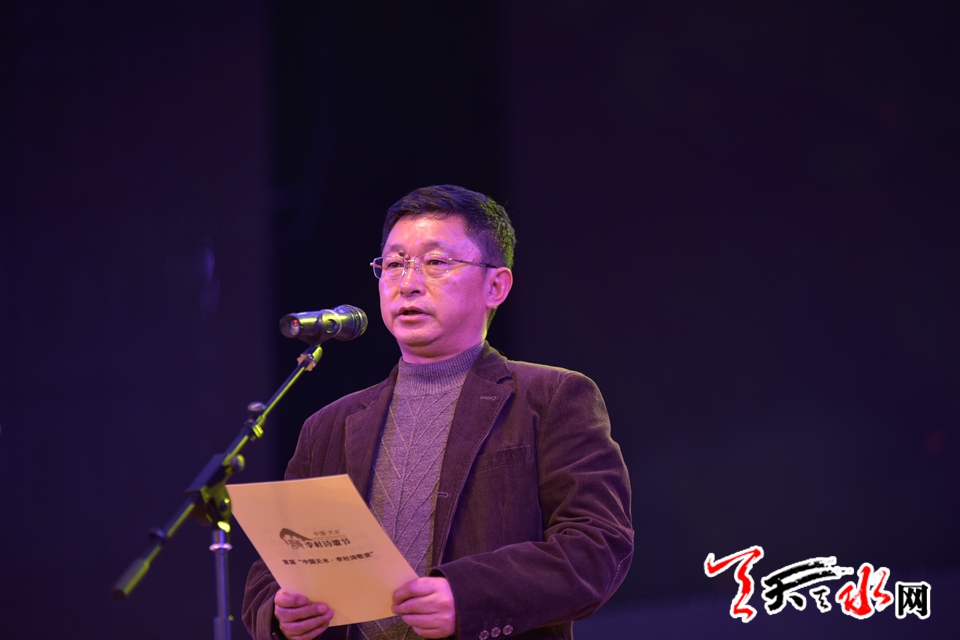 ????中共天水市委常委、組織部長、宣傳部長王正茂首先代表天水市委、市人大、市政府、市政協(xié),對各位嘉賓的到來表示衷心感謝和熱烈歡迎,對獲獎作者表示熱烈祝賀。王正茂說,在天水舉辦“李杜詩歌節(jié)”,既表達(dá)我們對偉大詩人的無限景仰和緬懷,也是傳承中華優(yōu)秀傳統(tǒng)文化的務(wù)實(shí)舉措。特別是在新的形勢下,天水作為“一帶一路”建設(shè)重要節(jié)點(diǎn)城市和華夏文明傳承示范區(qū)建設(shè)核心區(qū)域,以李白、杜甫留給我們民族的優(yōu)秀詩歌傳統(tǒng)促進(jìn)天水文化藝術(shù)事業(yè)大繁榮、大發(fā)展,是提升天水文化品位、擴(kuò)大天水對外影響力的有效行動。首屆“李杜詩歌獎”的成功揭曉,在彰顯中國傳統(tǒng)文化的恒久魅力,弘揚(yáng)李杜詩歌精神,引領(lǐng)和提振當(dāng)代漢語詩歌創(chuàng)作向經(jīng)典致敬的同時,必將激勵更多的優(yōu)秀詩人,書寫出更多來自人民、來自生活,謳歌時代精神、回應(yīng)時代關(guān)切的佳作。期盼并熱烈歡迎全國各地的作家詩人和文藝工作者,以“李杜詩歌節(jié)”為橋梁紐帶,走進(jìn)天水這片文化沃土,尋訪先賢足跡,書寫時代強(qiáng)音,與天水人民一道打造“詩意天水”,共享“李杜光芒”!