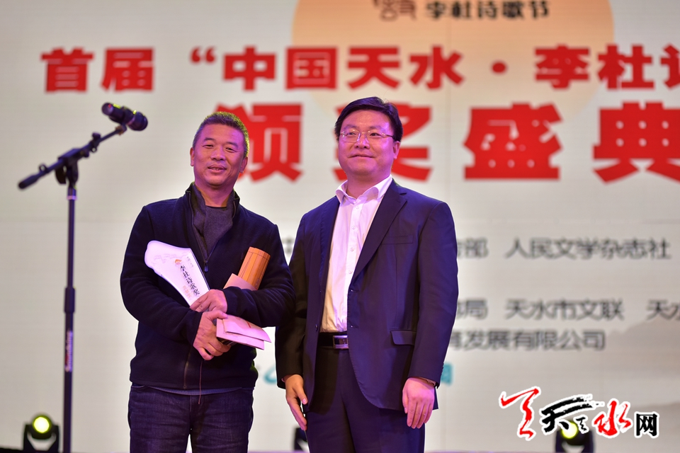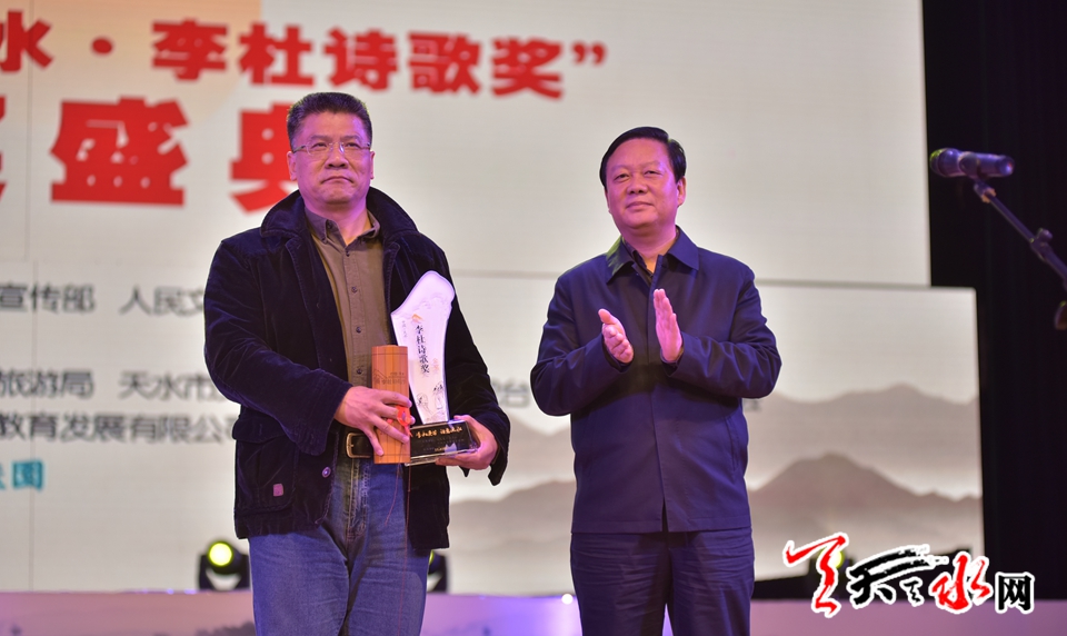中共天水市委副書記、市長楊維俊為金獎獲獎?wù)呒荫R加頒獎。(吉狄馬加先生因公未能前來領(lǐng)獎,特委托著名翻譯家、詩人、首屆“中國天水·李杜詩歌獎”評委汪劍釗先生代他領(lǐng)獎)
