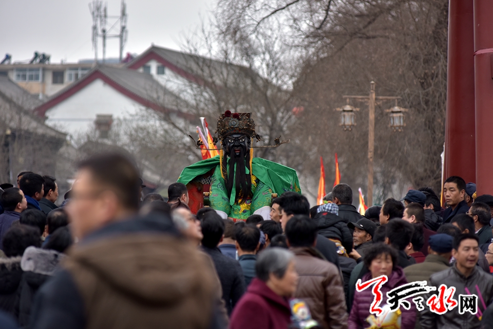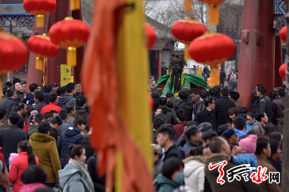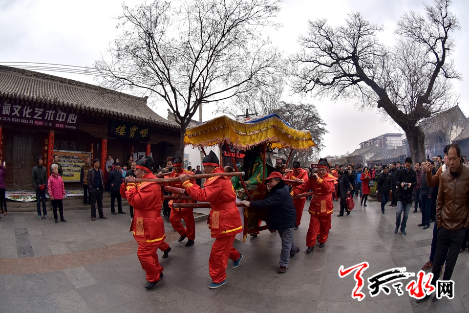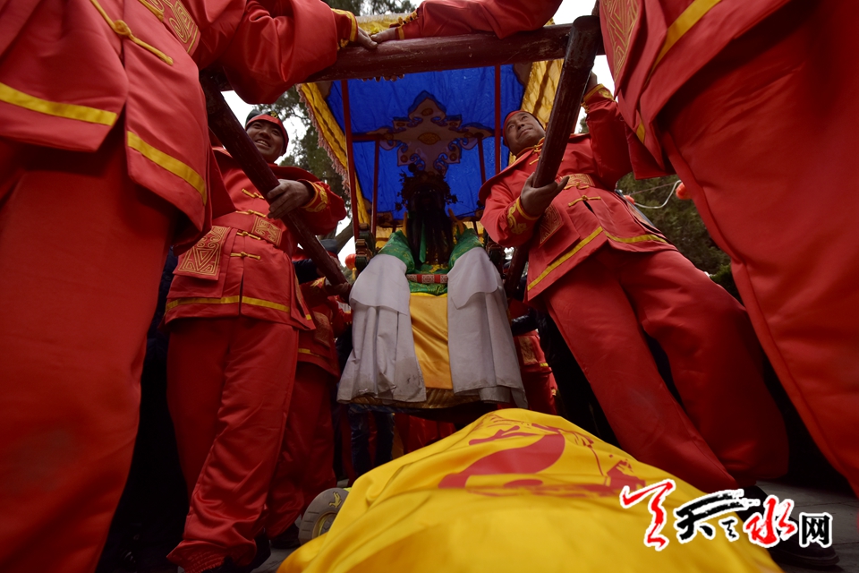 ????下午三時(shí)三十分,方神黑爺在浩浩蕩蕩儀仗隊(duì)伍的簇?fù)碇?,進(jìn)入伏羲廟,落座于先天殿月臺(tái)之上西側(cè)。主祭人明燭、焚香、化表。方神黑爺拜過(guò)伏羲之后,儀仗隊(duì)伍出伏羲廟,隨抬著榜文的儀仗隊(duì)伍繞伏羲城一周。沿路商鋪皆鳴炮相迎,以示敬仰。最后,主持人明燭、焚香、化表、獻(xiàn)茶之后,將榜文焚燒,由專(zhuān)人將榜文燃燒后的灰和圣水送至藉河中,祭祀儀式即告畢。