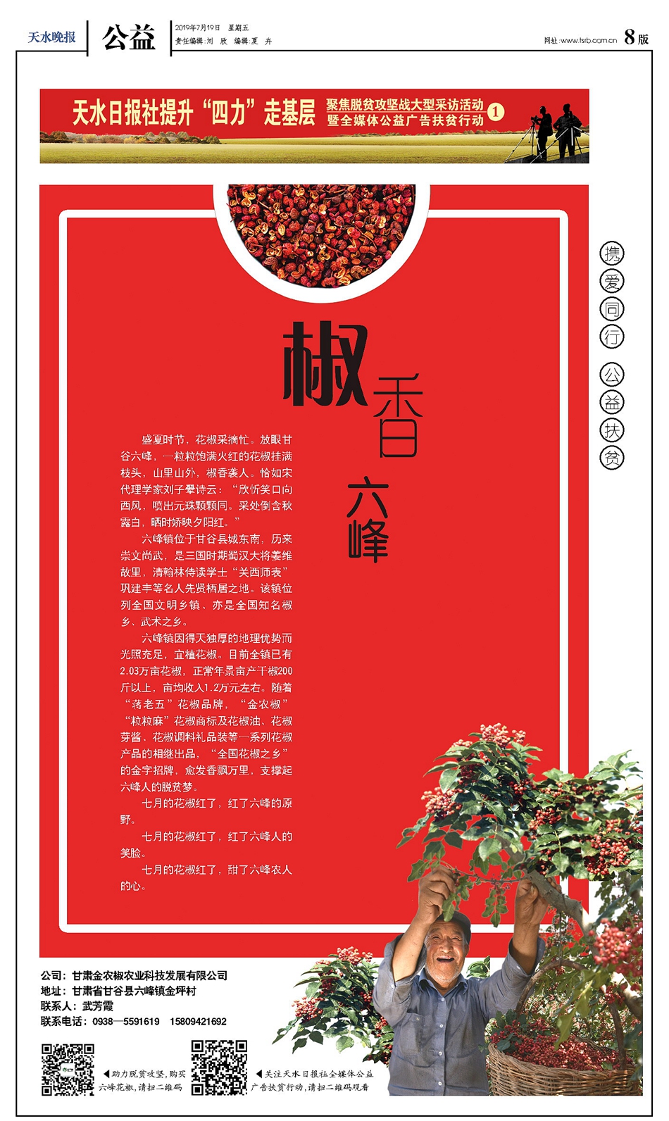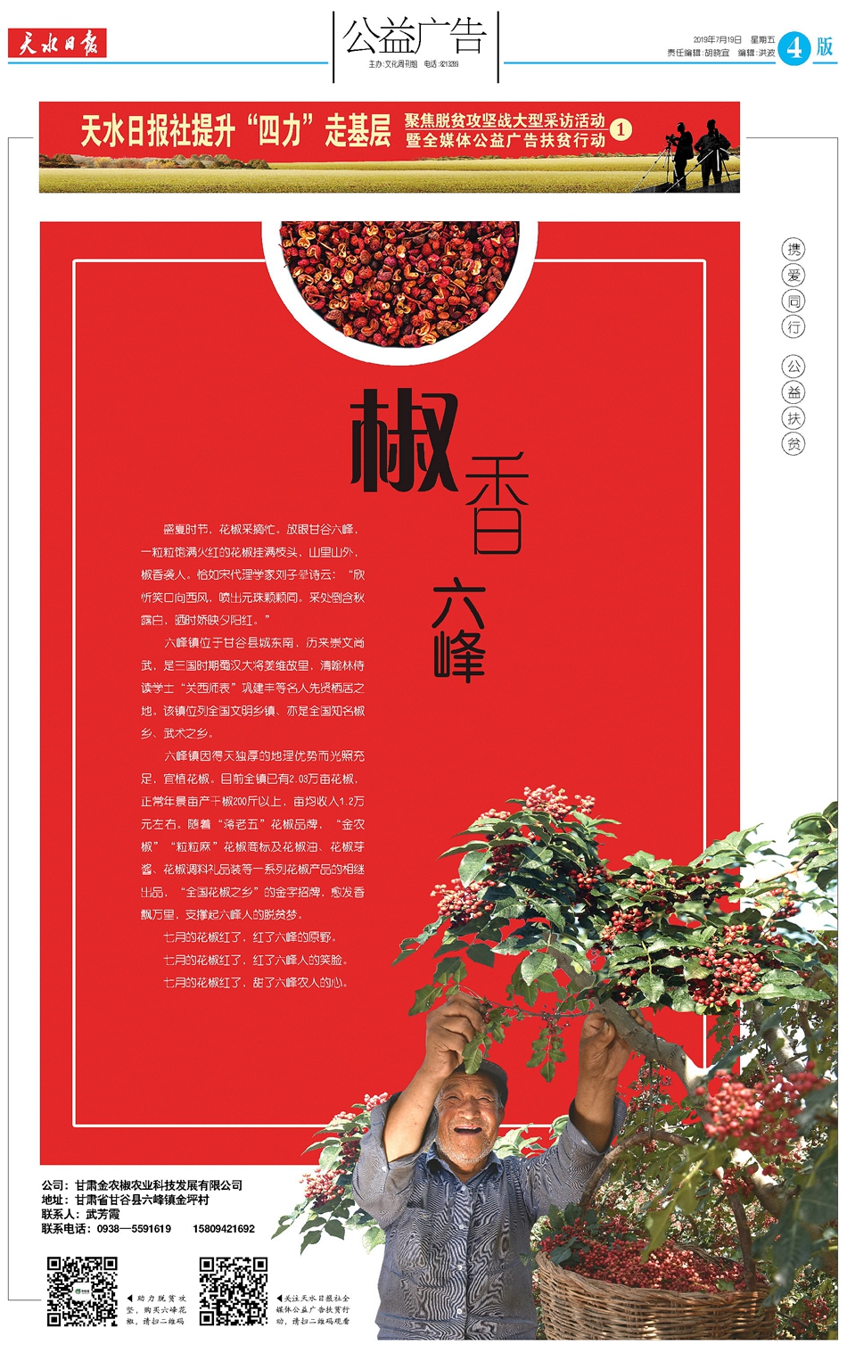 從今日開始,天水日?qǐng)?bào)社全媒體公益廣告扶貧行動(dòng)正式啟動(dòng),將用一年半時(shí)間,在《天水日?qǐng)?bào)》《天水晚報(bào)》分階段推出100個(gè)“助力脫貧攻堅(jiān)全媒體公益廣告”專版。天天天水網(wǎng)、天水日?qǐng)?bào)公眾號(hào)、天水發(fā)布等各網(wǎng)絡(luò)媒體平臺(tái)還將推出“扶貧公益廣告”專題、宣傳片,通過(guò)圖文報(bào)道、H5產(chǎn)品、短視頻等新媒體產(chǎn)品,創(chuàng)新傳播形式,強(qiáng)化傳播效果,擴(kuò)大傳播覆蓋面。第一期走進(jìn)甘谷縣六峰鎮(zhèn),關(guān)注六峰鎮(zhèn)花椒產(chǎn)業(yè),推薦六峰鎮(zhèn)花椒產(chǎn)品。
