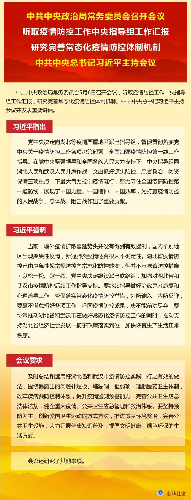 新華社北京5月6日電 中共中央政治局常務(wù)委員會(huì)5月6日召開(kāi)會(huì)議,聽(tīng)取疫情防控工作中央指導(dǎo)組工作匯報(bào),研究完善常態(tài)化疫情防控體制機(jī)制。中共中央總書(shū)記習(xí)近平主持會(huì)議并發(fā)表重要講話。