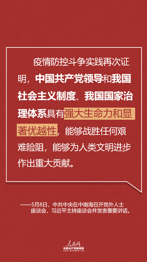 【編者按】5月8日,中共中央在中南海召開黨外人士座談會(huì),就新冠肺炎疫情防控工作聽取各民主黨派中央、全國(guó)工商聯(lián)和無(wú)黨派人士代表的意見和建議。中共中央總書記習(xí)近平主持座談會(huì)并發(fā)表重要講話。這次會(huì)議上總書記有何最新判斷和重要部署?人民網(wǎng)·中國(guó)共產(chǎn)黨新聞網(wǎng)為您梳理。