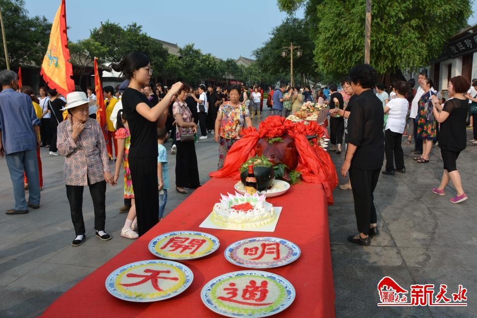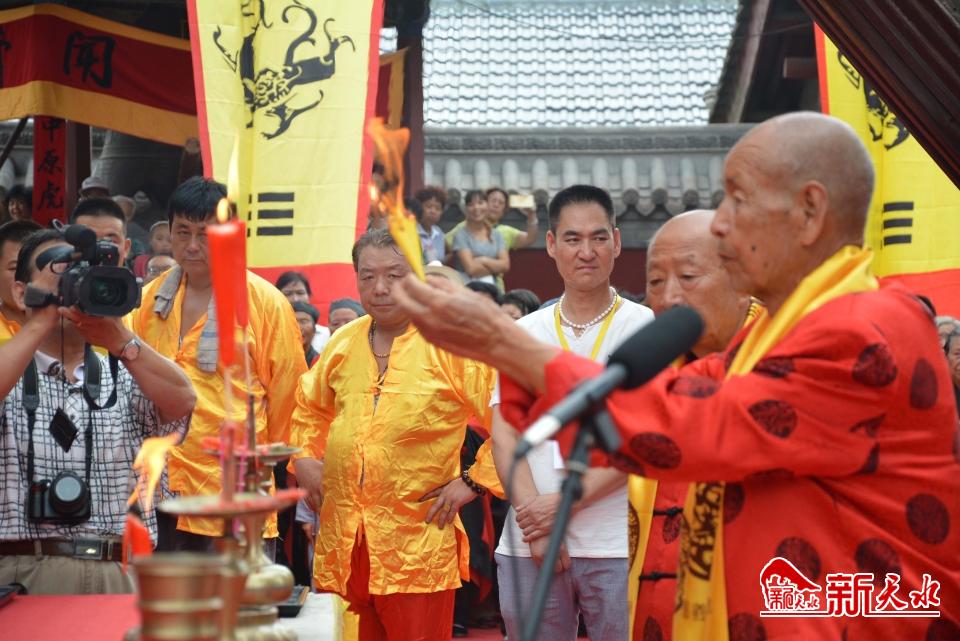 昭示榜文,則是祭祖典禮的固定程序。每年祭祖迎神之時,出示榜文,告慰太昊伏羲氏之神靈,贊譽人文始祖太昊伏羲氏的偉大功績,以示子孫懷念老祖宗之誠意,迎請?zhí)环耸仙耢蠼邮芎蟠赖炀匆?。每年榜文內容并不固定?/p>