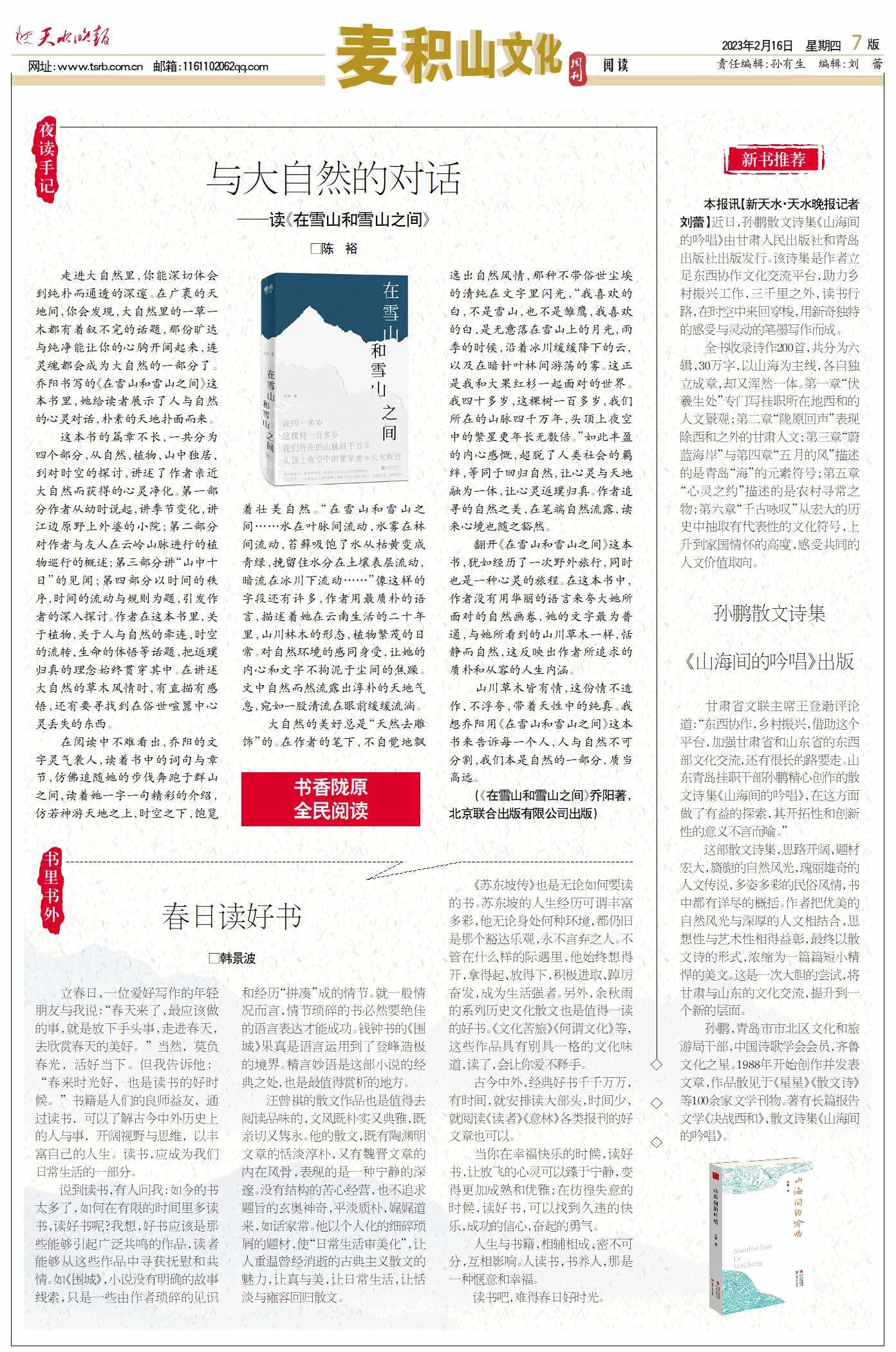新天水訊【記者劉蕾】近日,孫鵬散文詩(shī)集《山海間的吟唱》由甘肅人民出版社和青島出版社出版發(fā)行。該詩(shī)集是作者立足東西協(xié)作文化交流平臺(tái),助力鄉(xiāng)村振興工作,三千里之外,讀書行路,在時(shí)空中來回穿梭,用新奇獨(dú)特的感受與靈動(dòng)的筆墨寫作而成。