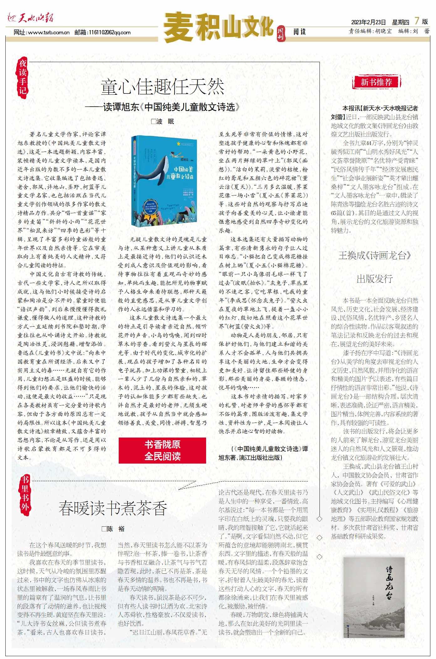 新天水訊【記者劉蕾】近日,一部反映武山縣龍臺(tái)鎮(zhèn)地域文化的散文集《詩(shī)畫龍臺(tái)》由敦煌文藝出版社出版發(fā)行。