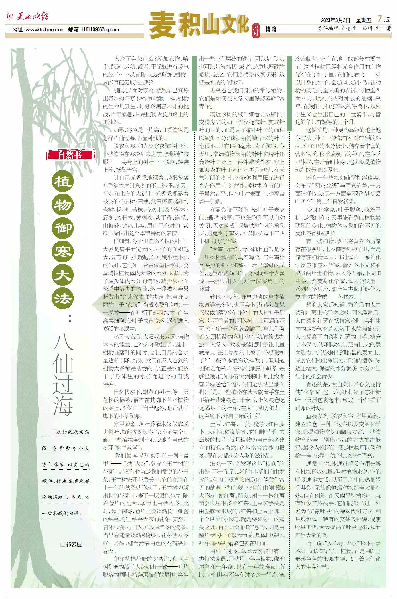 在顯微鏡下觀看,松柏葉子表皮的細胞壁較厚,下皮細胞孔可以自動關閉,天然筑成“銅墻鐵壁”似的角質層,避免水分蒸發(fā),可以抵抗零下三四十攝氏度的嚴寒。