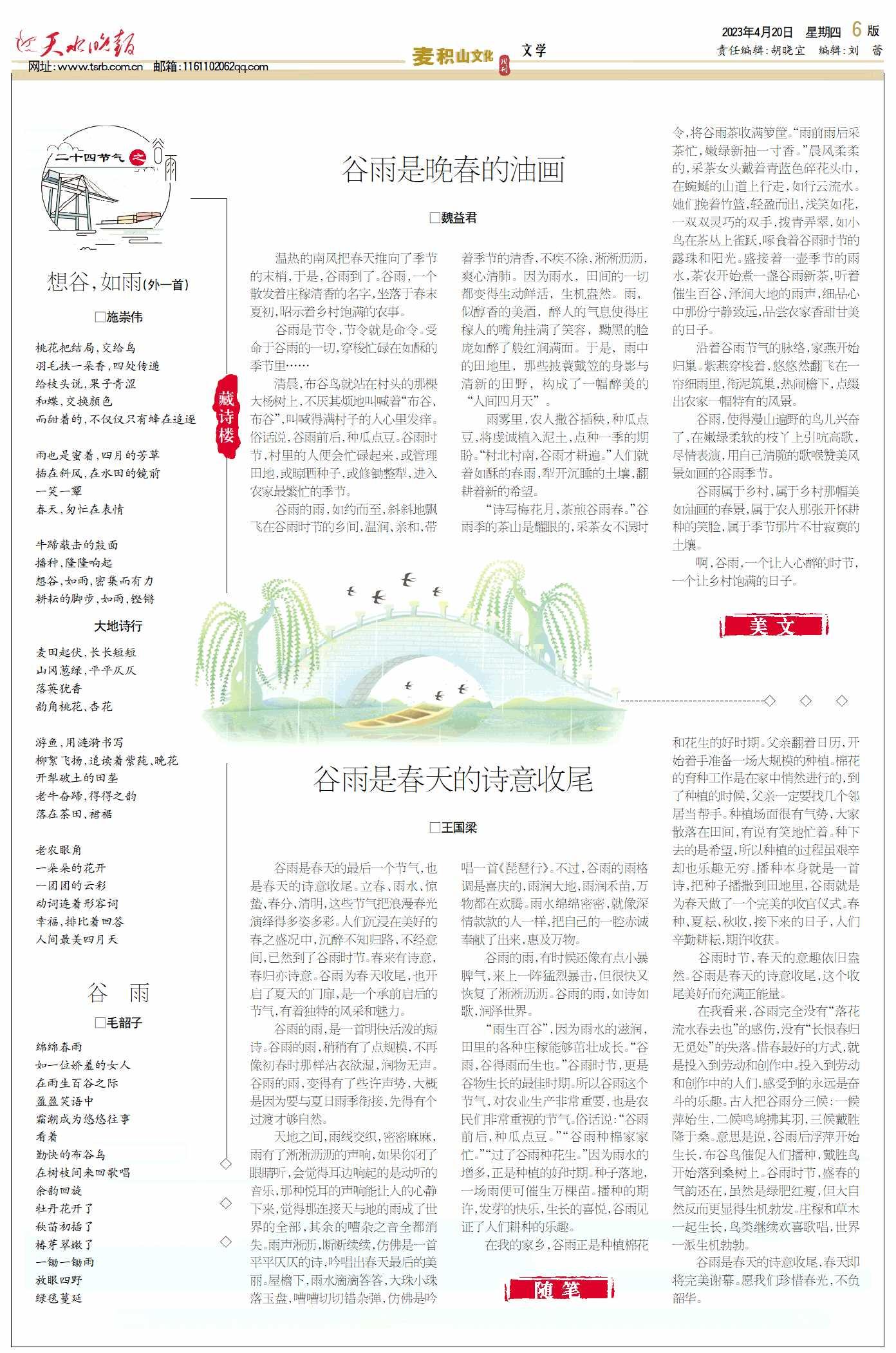 谷雨時(shí)節(jié),春天的意趣依舊盎然。谷雨是春天的詩意收尾,這個(gè)收尾美好而充滿正能量。