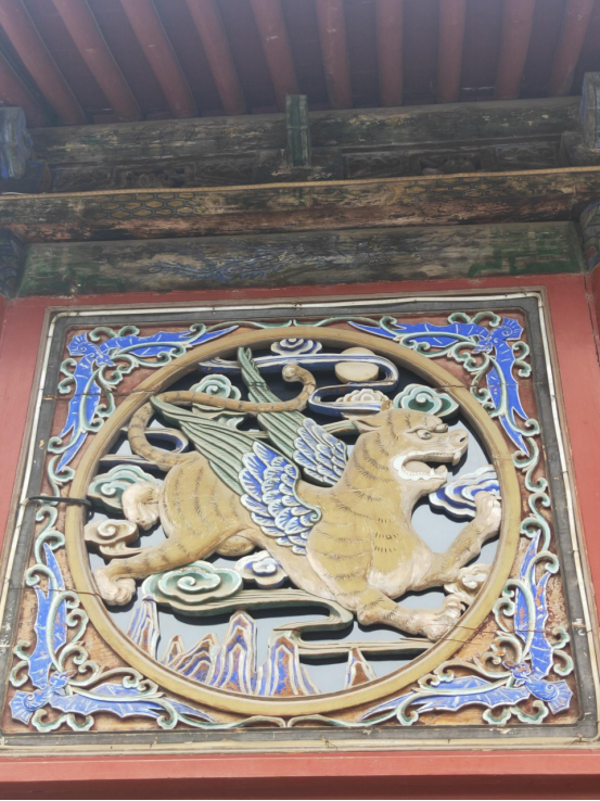 戲樓二樓為戲臺,其當心間安裝六抹活扇隔扇門,唱戲時這些門扇可以臨時取下。二樓檐下裝透雕栱間板,雕刻內容有蓮花、牡丹、二龍捧壽等,寓意福壽連連、富貴清廉。兩盡間檻窗鏤雕翼龍、翼虎圖案?;[而風生,風生而萬籟皆作,虎伏而風止,風止而萬籟皆息。而《博雅》《釋魚》中言:“有翼曰應龍”。可見,這翼龍翼虎暗含風調雨順的美好期盼。