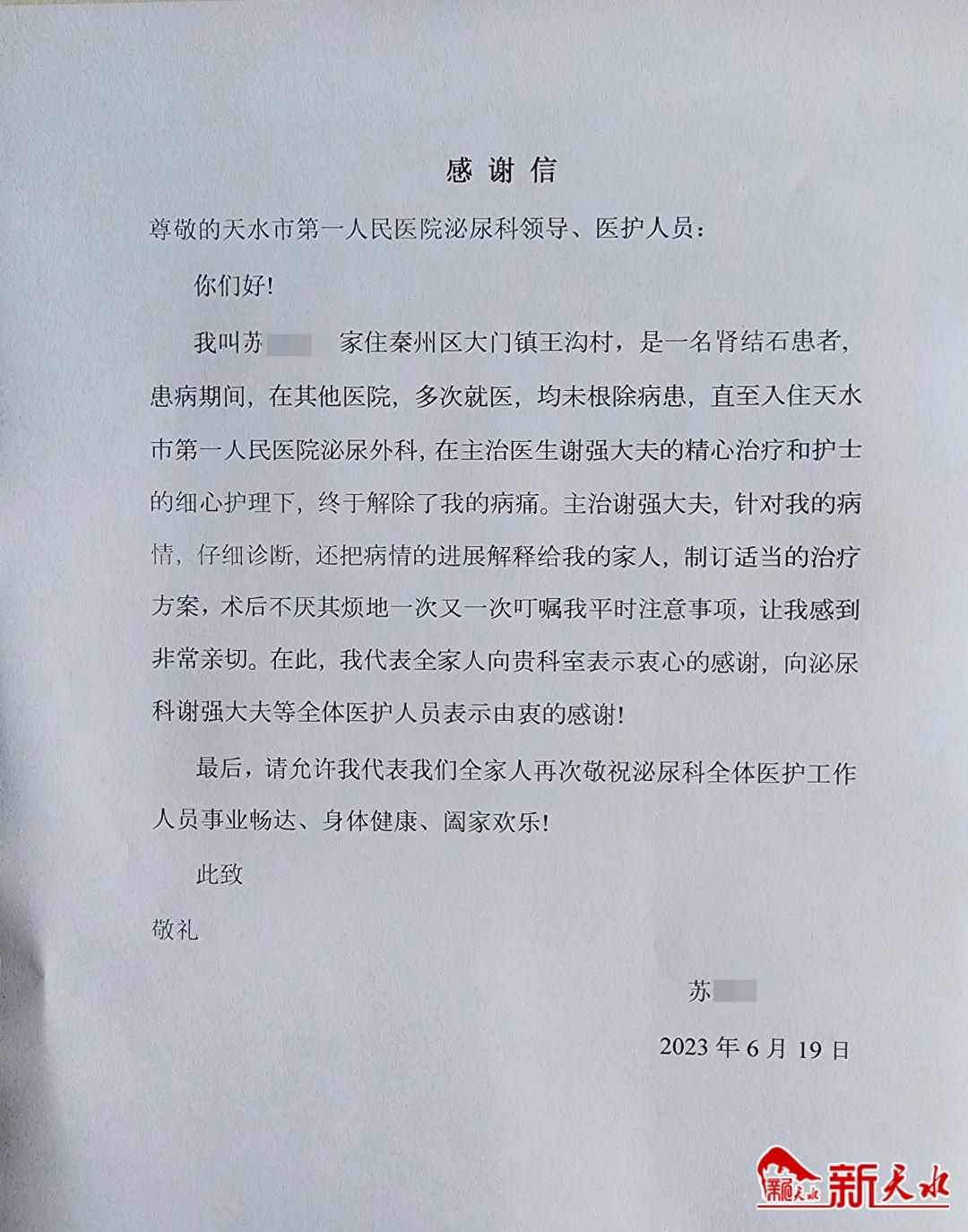新天水訊 近日,市一院收到了一封來自患者家屬的感謝信。信中反映了醫(yī)護(hù)人員盡職盡責(zé)、專業(yè)周到地治療和護(hù)理患者所做的努力和奉獻(xiàn),也表達(dá)了患者對醫(yī)院人性化、智慧化服務(wù)給其留下的深刻印象和滿心感激。