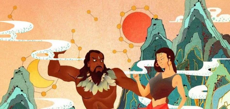華胥氏去世后,伏羲、女媧兄妹二人靠采野果打獵為生,一晃長到十七八歲。一天,妹妹對哥哥說:“現(xiàn)今天下的人太少,我們兄妹如能結(jié)為夫妻,生兒育女,平安度日,白頭偕老該有多好??!”哥哥聽罷沉思良久后對妹妹說:“結(jié)婚生兒育女是終身大事,不可兒戲,首先要有機(jī)緣,還應(yīng)有天作之合,上天作證,大地為媒。”