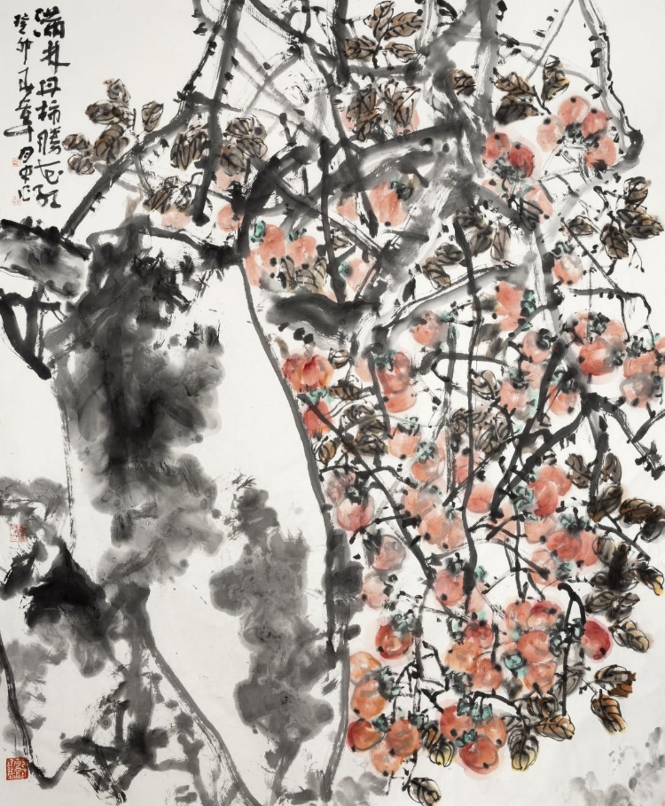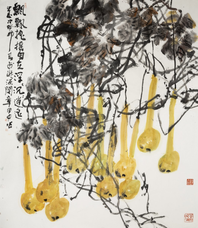 實際上,大寫意花鳥畫是寫生記憶中的花鳥,是對生命感受到的花鳥的深情。如果說境界是寫意花鳥畫的靈魂,筆墨是性情的體現(xiàn),那么寓興的功能就體現(xiàn)在“有以興起人之意者,率能奪造化而移精神”。來源于生活而高于生活,來自于客體而奪造化移精神。惲壽平在評畫時曾說:“其意象在六合之表,榮落在四時之外?!边@句話道出了花鳥畫穿越時空追求精神境界的真諦。章月中的寫意花鳥畫重氣局、重境界、重精神,有文化傳統(tǒng)之血脈,有當(dāng)代生活之底蘊(yùn),有洋為中用之取舍,托物言志,寓情于理,具有鼓舞人民朝氣蓬勃邁向未來的崇高之美。他畫的牡丹、紫藤、梅花、荷花、水仙花、向日葵、仙桃、柿子、石榴、葫蘆、魚、鳥等等,雖是小題材,卻是大作品,形神兼?zhèn)?,意境深遠(yuǎn),能讓人們一看就動心,能讓人們發(fā)現(xiàn)自然的美、生活的美、心靈的美,能讓人們追求探索知、情、意、行相統(tǒng)一的中華美學(xué)精神。